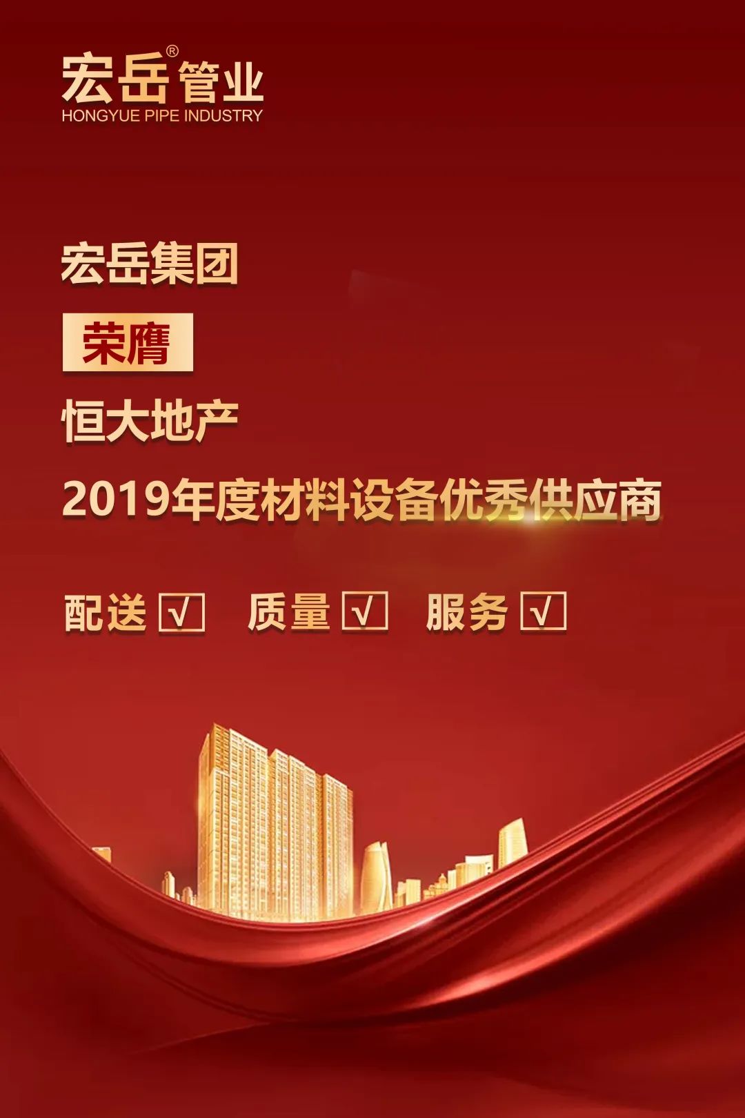 恒大地产集团作为中国最具影响力的房地产企业之一,一直以来秉持品质至上的原则,此次评选,是根据《材料设备供应商年度综合评估方案及细则》,从材料配送、产品质量、问题投诉率等多方面展开评定,好博(中国)体育从管材管件类品牌中脱颖而出,被客户评为产品质量和品质管控水平最高的合作伙伴之一。