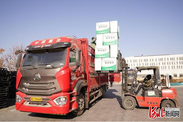 1月17日,两辆满载塑料管材的运输车辆从河北省秦皇岛经济技术开发区发往目的地,这些抗疫物资将用于石家庄和邢台的隔离场所项目建设。